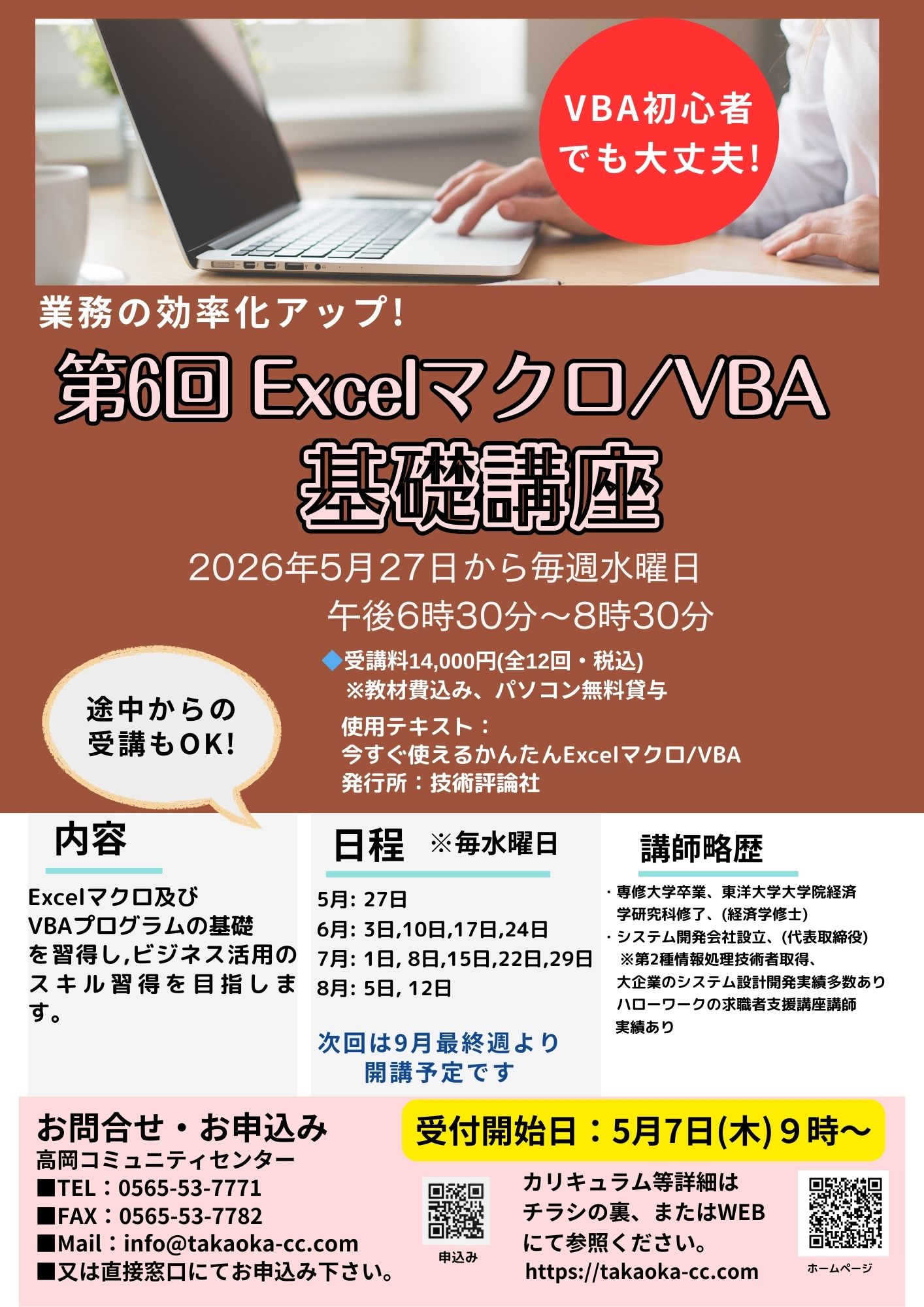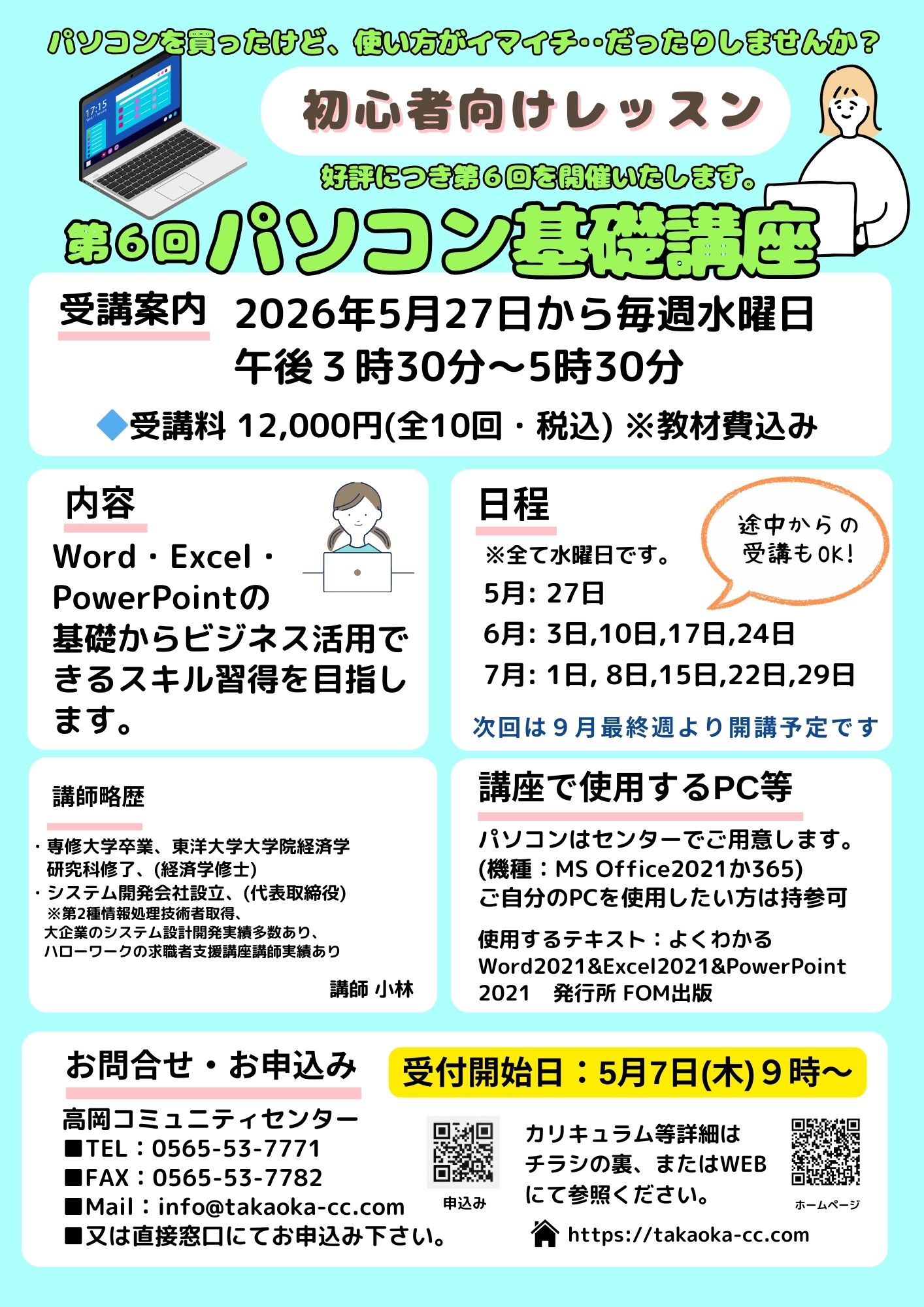 TEL:0565-53-7771 FAX:0565-53-7782 MAIL:info@takaoka-cc.com または受付窓口で直接お申込みください。 |