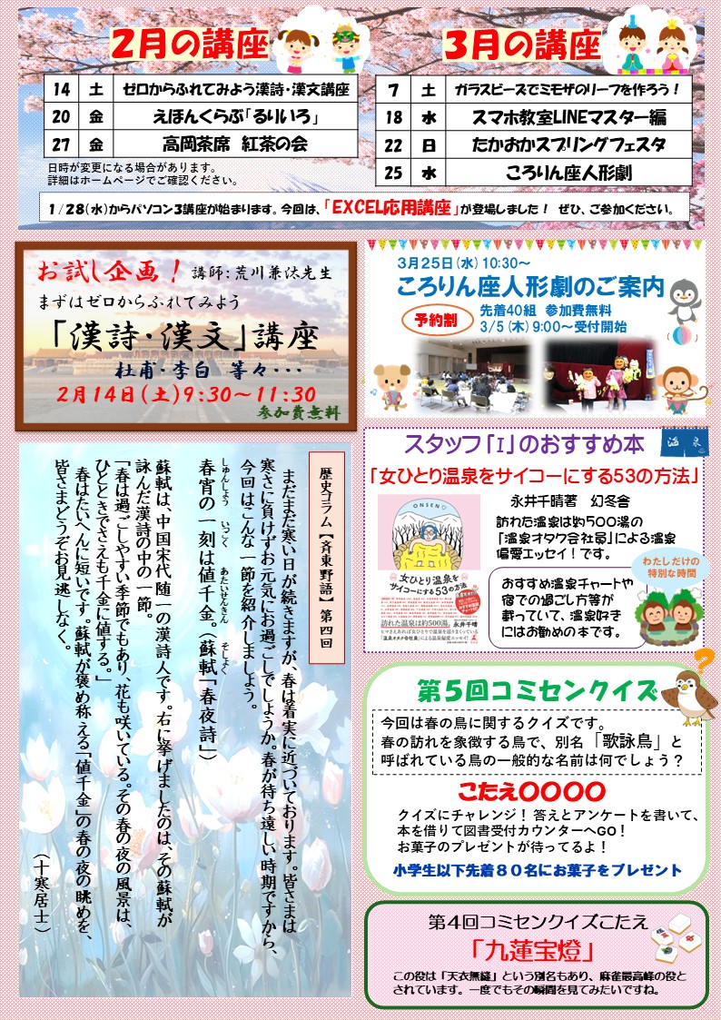 今後のイベント予定、歴史コラムなどをのせていきます。またコミセンクイズもありますので